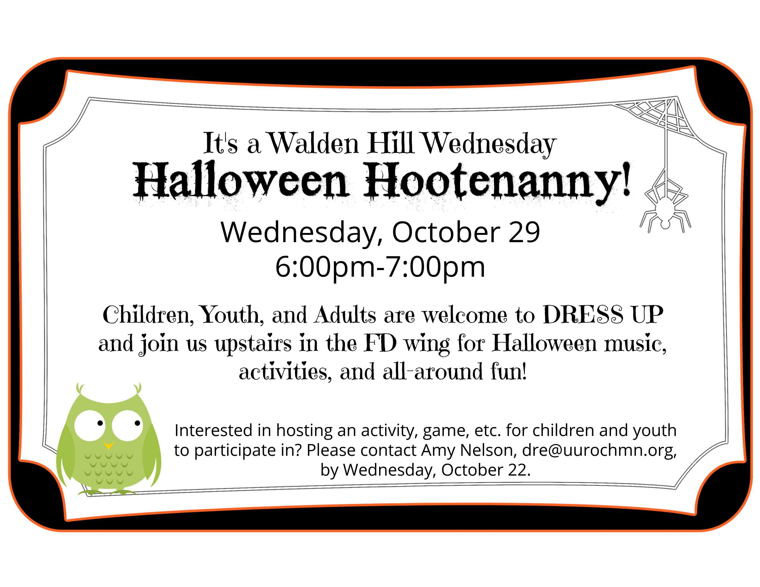 • Fireside Chat/Forum/Activity: Halloween Hootenanny! Children, Youth, and Adults are welcome to Dress up and join us upstairs in the FD wing for Halloween music, activities, and all-around fun!