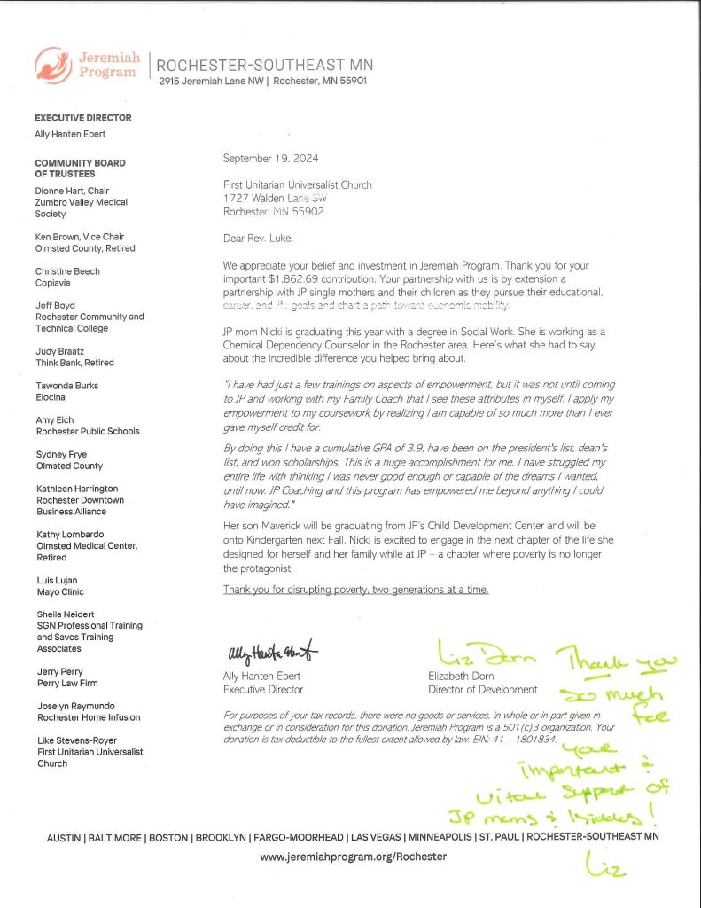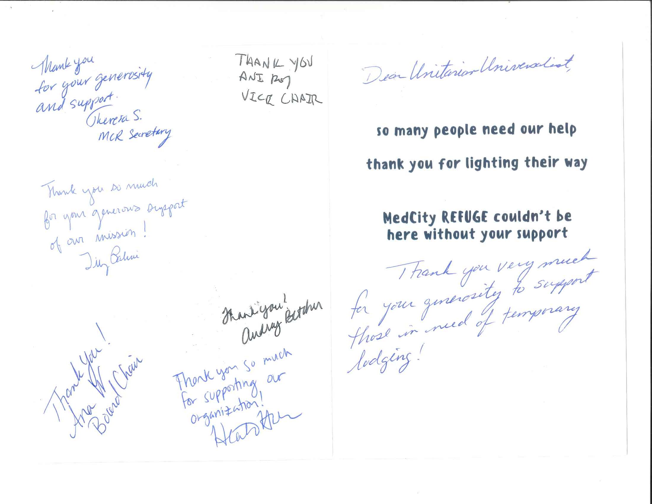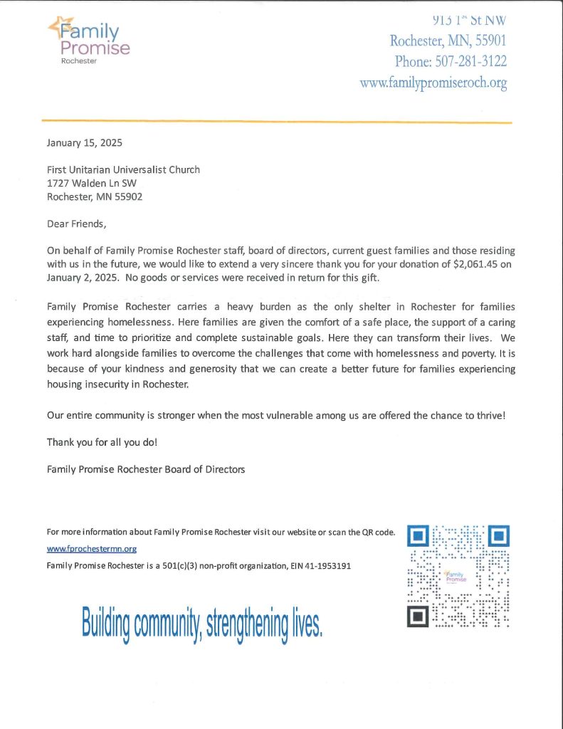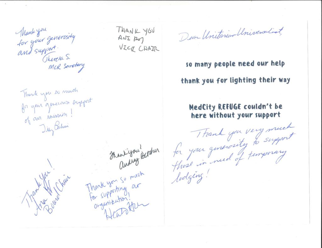 As we practice justice, we often give time and/or money to local and national organizations. Often, these organizations express their gratitude by sending First UU cards of thank you. This page will showcase many of these cards of thank you in appreciation of all for our members and friends who have given in so many ways.